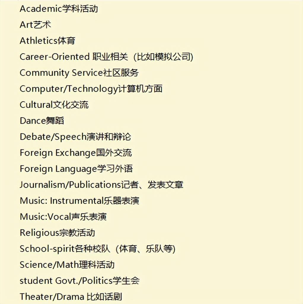 为了帮助大家更好的认识EC(课外活动),可以先来看看美国学校们了解申请人EC的COMMON APPLICATION中的活动选项。这一项有10个活动可以参加,一般会涉及到以下这些类型的活动: