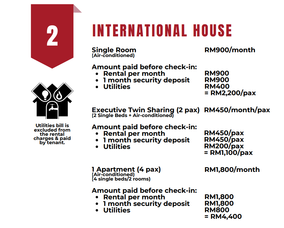 下图是马来亚大学的其中一个宿舍收费标准,普通单人间每月900RM,约合1400人民币。
