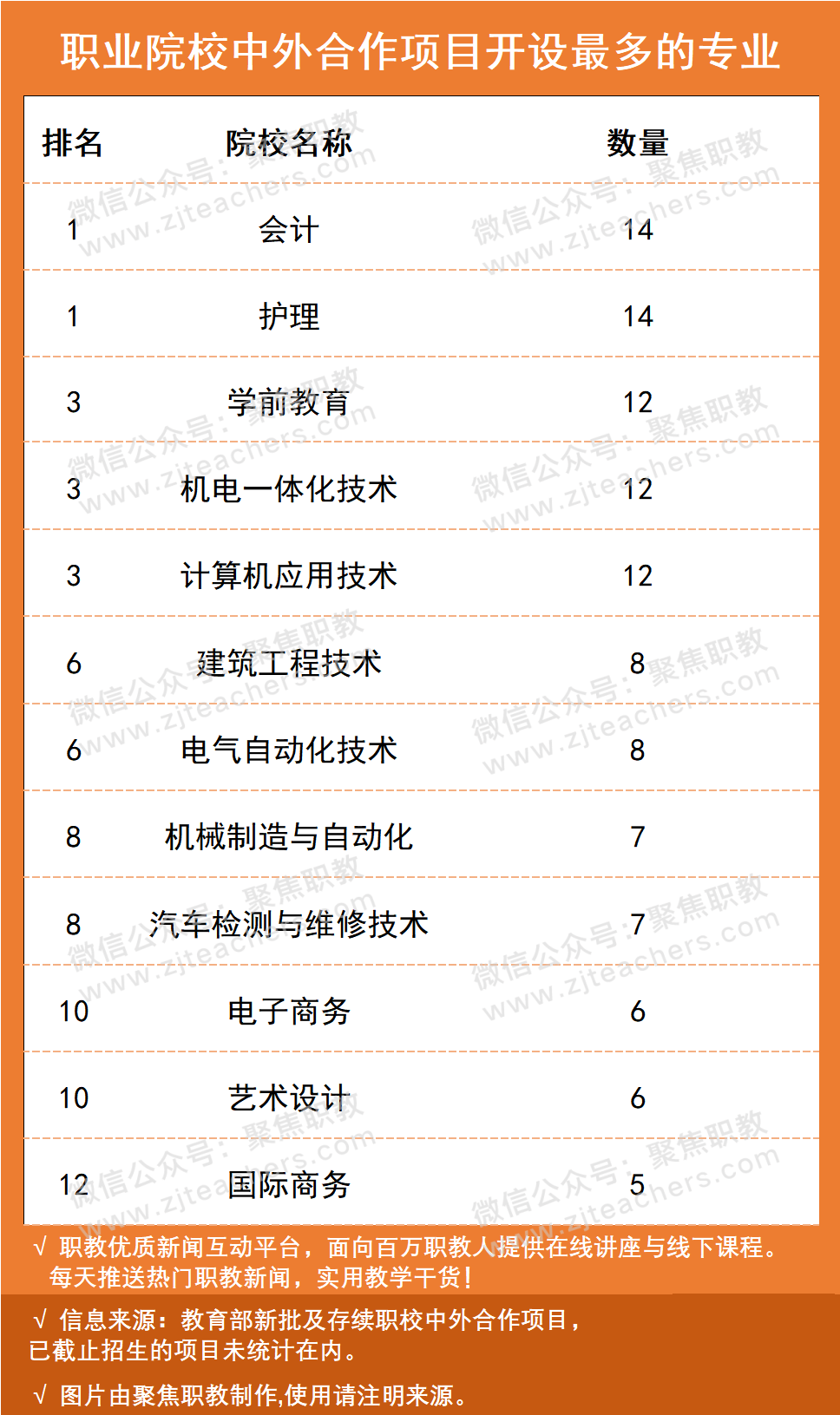 从上表我们可以看到合作项目开设最多的专业是会计、护理专业,数量为14个。学前教育、机电一体化技术、计算机应用技术专业开设数量并列第三。