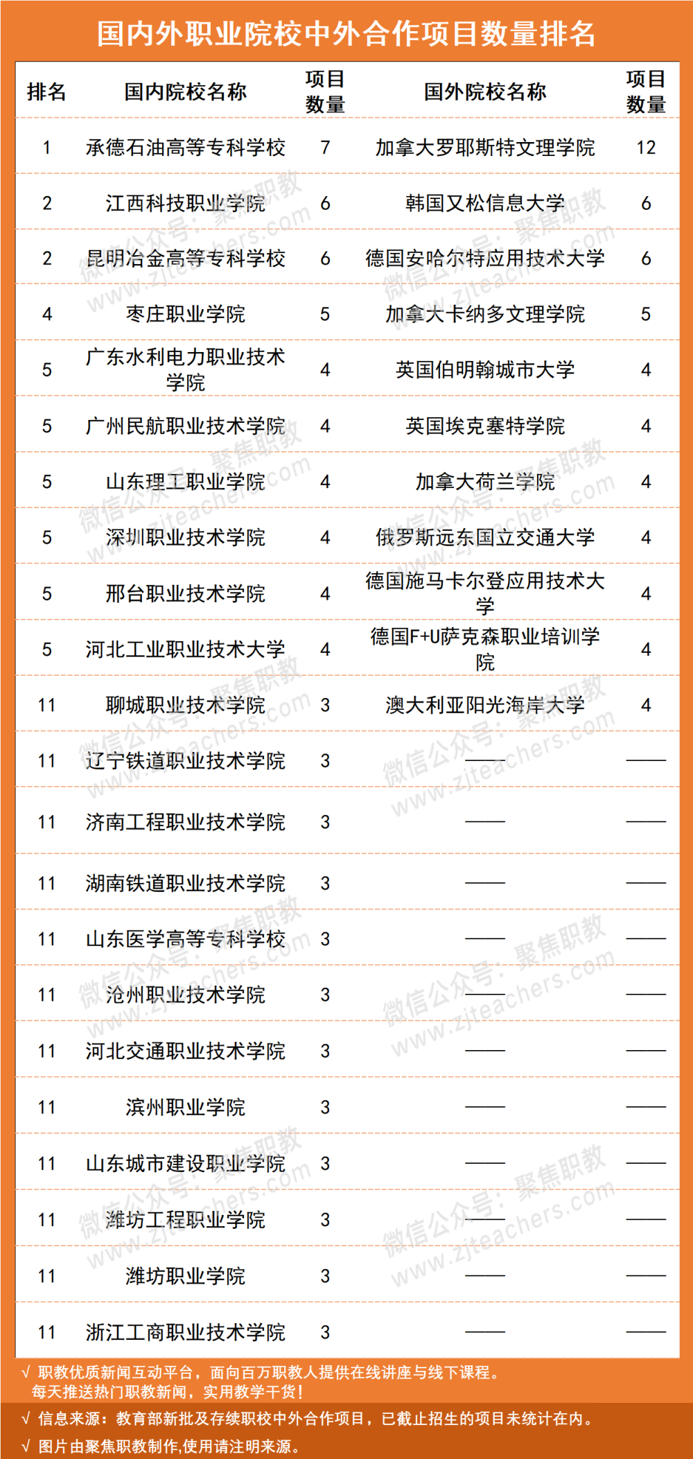经不完全统计,我们可以看到承德石油高等专科学校是中外合作项目最多的职业院校;其次是江西科技职业学院、昆明冶金高等专科学校,均以6个项目的数量紧随其后。