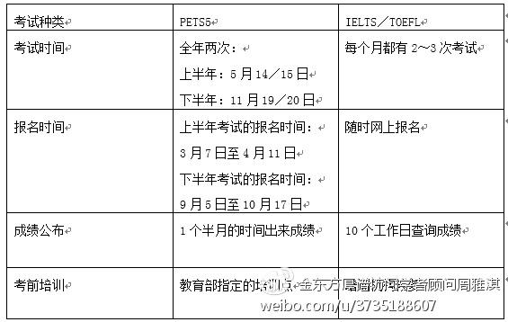 【对比说明】从考试时间、报名时间以及成绩公布来看,雅思或者托福的时间相对灵活而且出来成绩的时间更快一些,对于英语基础较好,希望尽快拿到考试成绩的申请人来说,考雅思或者托福肯定是最佳的选择。PETS5的考试虽然也有难度,但是相比较来说准备时间充裕,在准备充分的情况下也可以尝试,但是记得一定要提前报名哦,错过就要等半年啦。当然无论是雅思还是PETS5,对于大多数公派申请人来说,能够直接通过考试达到公派语言要求的确实是少数,大部分还是通过参加培训的形式,接下来我们就说一下公派英语培训。