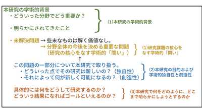 例:従来より、〇〇について, △△に応用する際にoooooという問題が生じてきた.そこで本研究では, 〇〇においてcccccccな手法を検討することを目的とする.