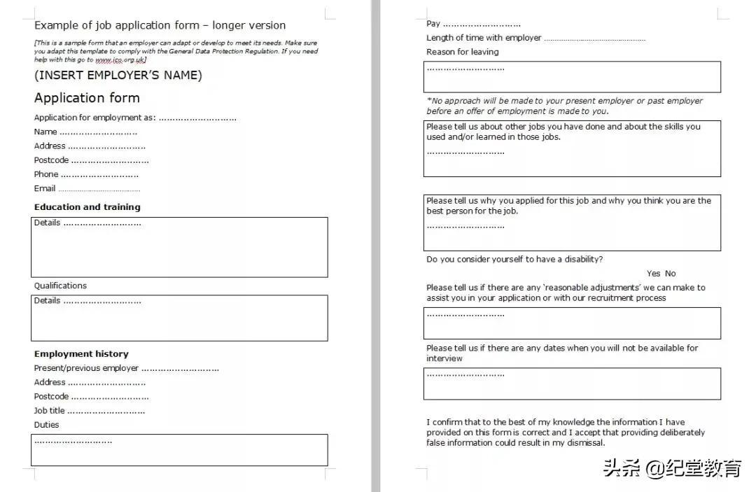 申请表上的内容跟个人简历和求职信的内容很像,都包含了个人信息、教育经历、工作经验等等。不同的是,申请表要更加详实一些。