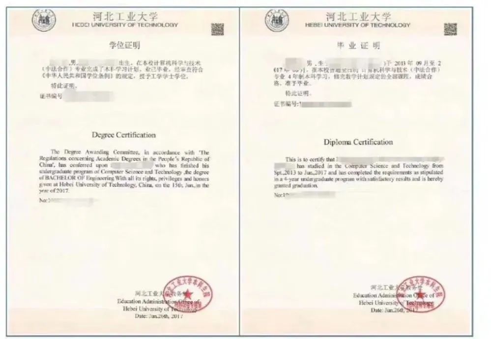 形式1:双证原件的扫描件(盖章)+英文翻译(盖章)=同一张纸上