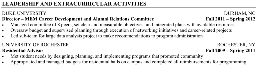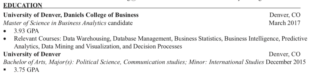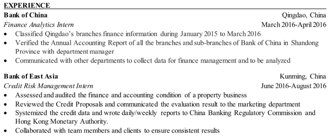 从以上的示例中可以看出,简历的书写不同于PS或是SOP,不需要用完整的句子来描述之前做过的的事情。每句话以动词开头,控制在两行以内,并注意使用bullet points,让所有经历简洁明了。