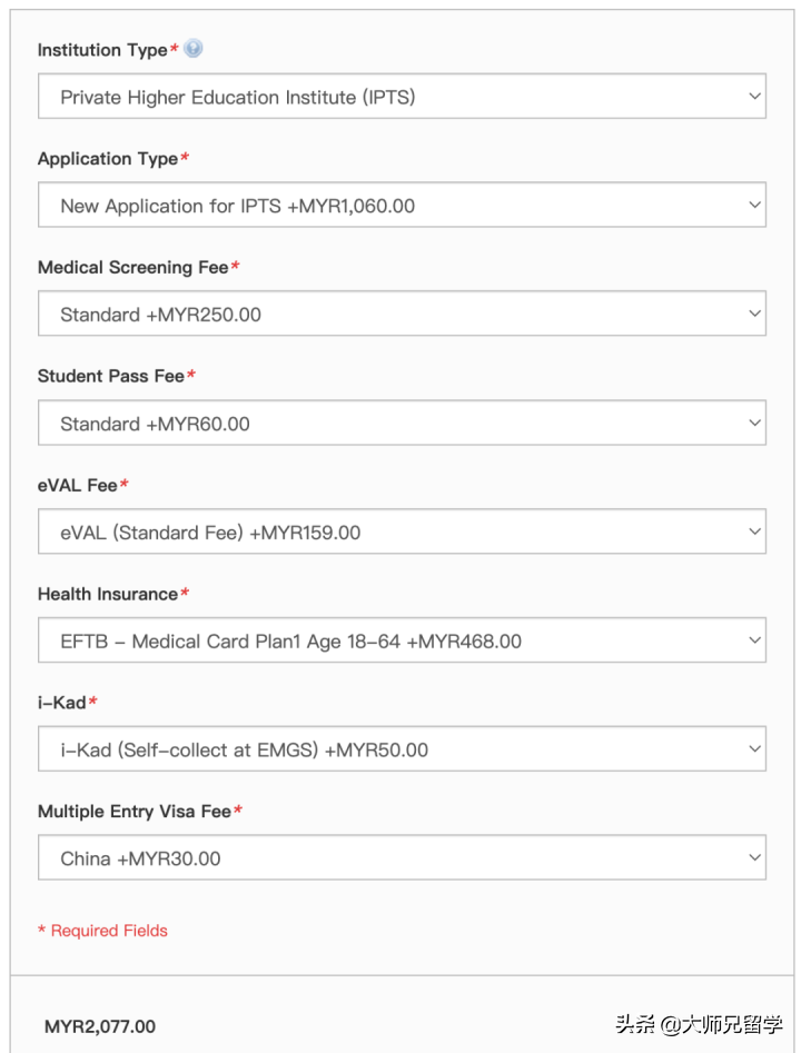 申请费用可以通过马来西亚教育部的官方网站计算,根据你所申请的大学的类型以及学习类型、保险类型等计算总体的签证费用,大学的签证费用一般最低(选择最基础保险)是2077RM(马币)。如果你觉得自己申请太麻烦,你也可以找相应的签证中介来进行申办,可能会有一笔中介费。