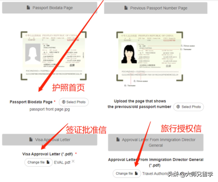 此外,还需要在网站上传e-VAL,护照照片,旅行授权信(Approval Letter From immigration Director General)等材料并按照流程支付。