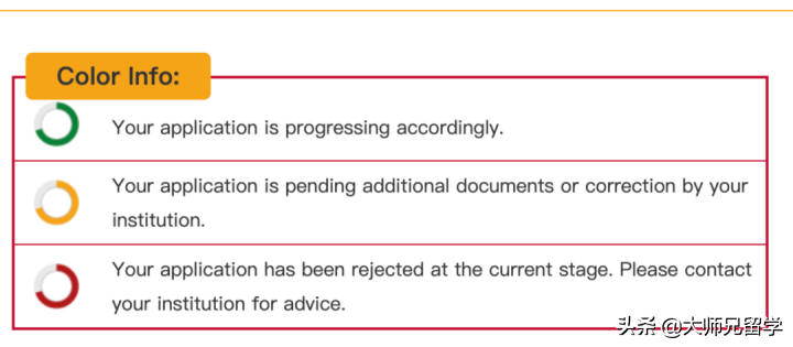 流程图标进度为黄色的时候,说明签证申请正在通过你所申请的学校进行审核,需要学校提供一些额外资料或者信息纠正。
