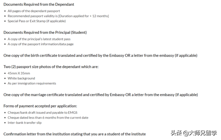 在马来西亚进行超过12个月的全日制学习的本科及以上学生,可以申请携带家属,为家属申请家属签(Dependant Pass)。