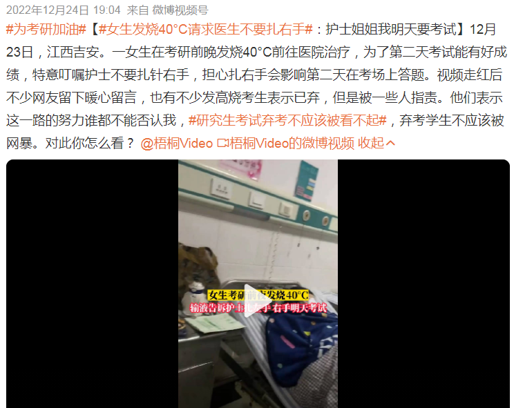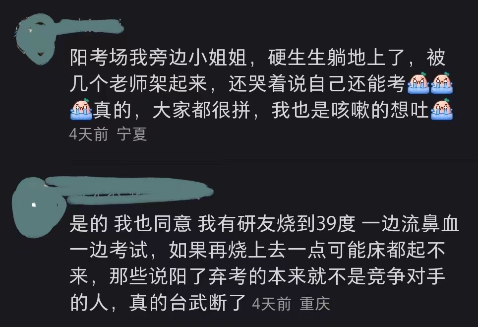 也有一些症状较轻的同学,强撑着坚持参加了考试。据报道,不少考场内外咳嗽声此起彼伏,有人在考前路过的厕所里听到了呕吐声。在考试过程中,有些考生甚至因为病情严重而被送往医院。