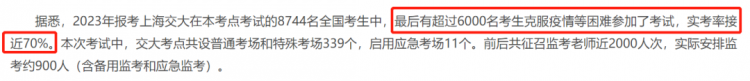 今年报考上海交大在本考点8744名考生中,实考6000人左右,缺考率在30%左右。