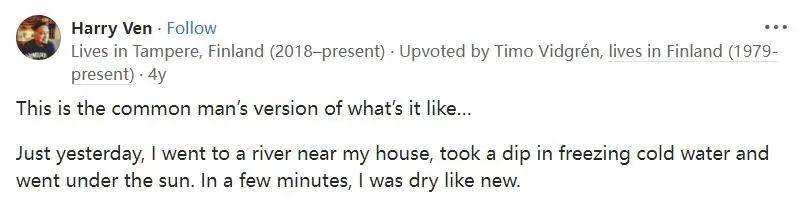 "一旦下雪,即使是冬天也很有趣。你可以去桑拿、冰上游泳或在湖上散步(是的,在湖上!)"