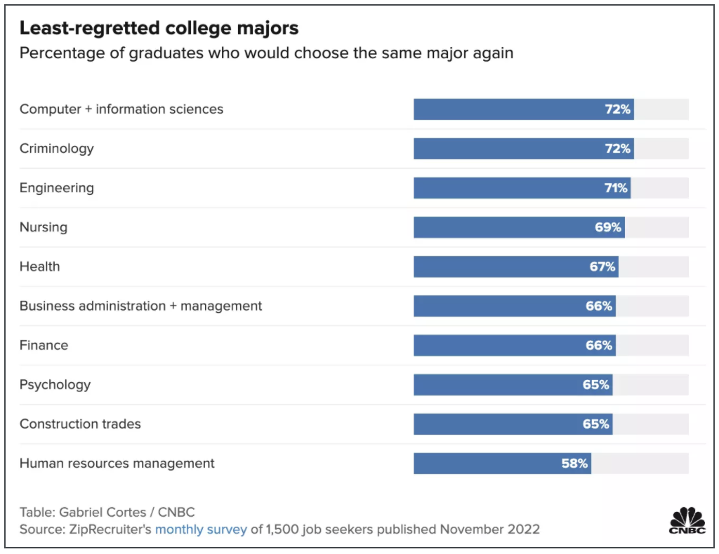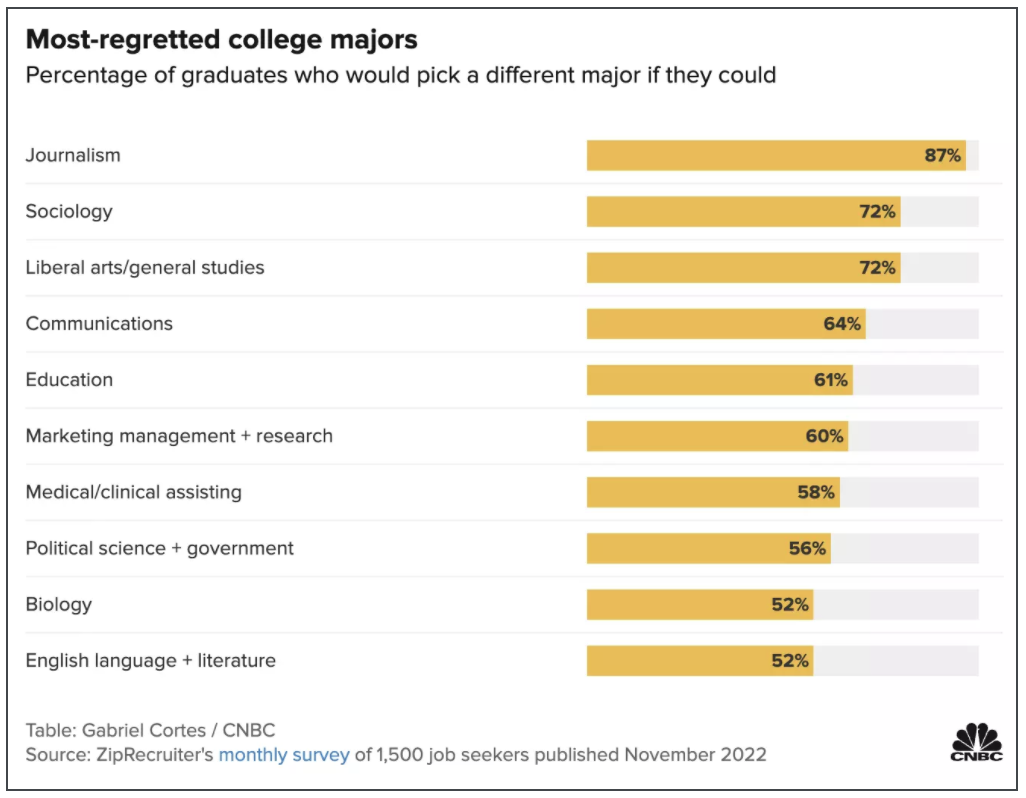 美国知名招聘网站ZipRecruiter,曾对1500名求职中的大学毕业生展开调查,结果显示,44%的调查者对自己的当初选择的专业后悔莫及,而最后悔的10大专业中,文科专业成为炮火的轰炸区。