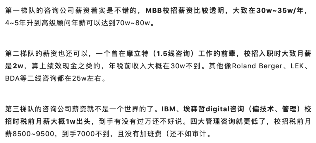 MBB校招咨询师就可拿到30-35w/年;摩立特年收入近30w;L.E.K.等二线咨询公司的咨询岗在25w左右;IBM、埃森哲税前大约1w出头.....主要区别还是看孩子进哪个梯队的公司~