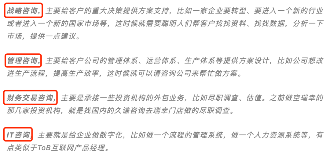 咨询嘛,本质就是一帮聪明人给有钱人提供服务,基本上可以分为战略咨询、管理咨询、财务交易咨询、IT咨询等。