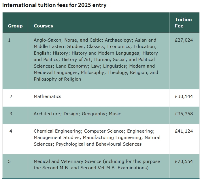 剑桥大学国际本科生的学费在£27,024-£70,554之间,相比去年上涨约5%。医学专业涨幅最高,比去年上涨超过3000英镑。