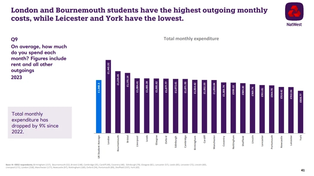 去年,英国银行Natwest发布了《2023年学生生活指数》,该报告覆盖来自63个城市的3,052名英国大学生,对英国各城市的生活花销进行了统计。