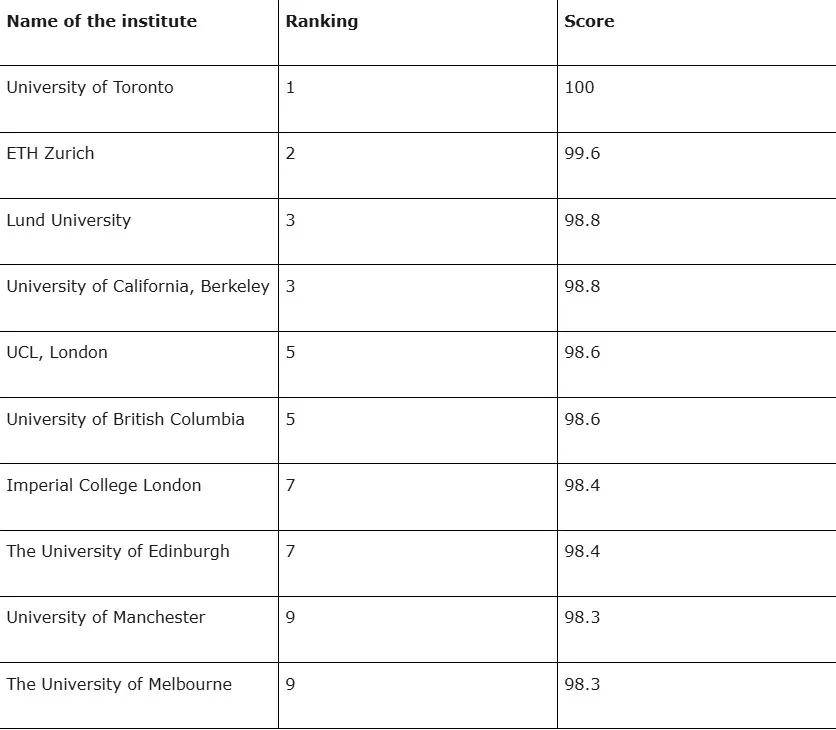 多伦多大学击败苏黎世联邦理工学院 (ETH Zurich)、加州大学伯克利分校 (University of California, Berkeley)、斯坦福大学 (Stanford University) 和哈佛大学 (Harvard University) 等知名学府,荣登榜首。