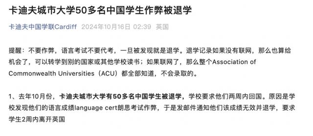 此前,英国卡迪夫城市大学发布消息,称有50名中国留学生被退学,并要求这些学生在两周内回国。校方表明:这些学生的朗思考试成绩作弊,被视为无效。