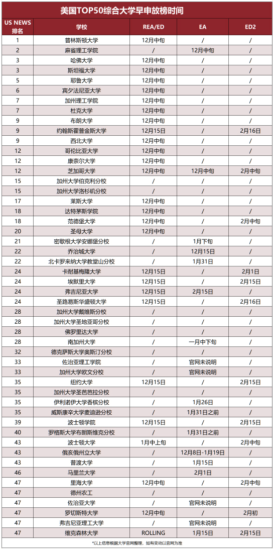Top 50综合大学早申放榜时间