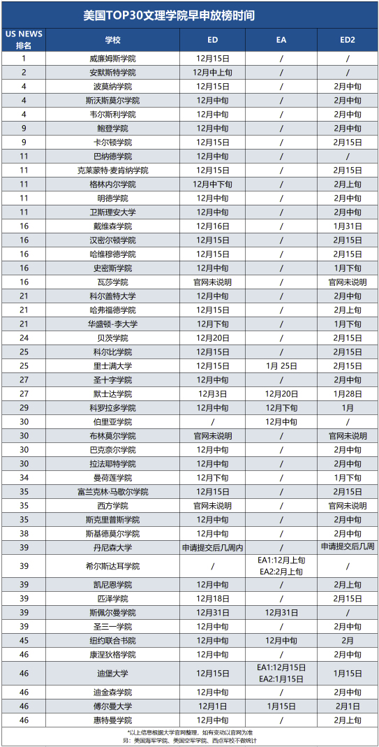 这里为大家汇总了一份TOp50美国综合大学和TOp30美国文理学院EA和ED各申请批次的放榜时间。