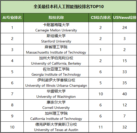 全美最佳本科人工智能强校排名
