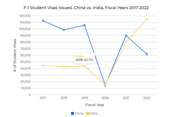 2022年,向中国学生发放的F-1签证数量下降了35%以上,而印度则经历了2021年以外有史以来最大的单年增长,增幅超过43%。