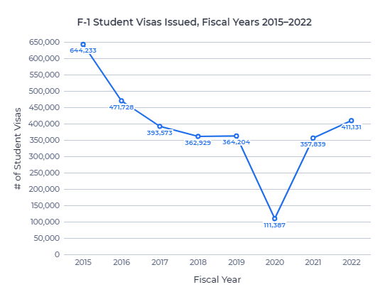 值得一提的是,此前中国国内的“清零”政策使得许多中国学生几乎无法前往美国学习。这些国内限制比国际旅行限制持续的时间长12至18个月,可能是这种急剧下降趋势的主要原因。2023年应该会给我们一个明确的答案,关于中国学签的数量是会反弹还是继续衰退。
