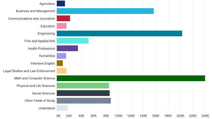 从2022/23年Open Doors报告公布的美国留学生专业选择上看,数学和计算机大类人数遥遥领先,为240230人;其次为工程类专业,共计202801人。两者相加不难发现,半数留学生在美国选择了STEM专业。此外,商业和管理专业也广受留学生欢迎,就读人数为157281人。美本留学趋势