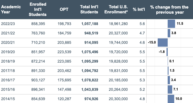2022/2023学年,共有858,395名来自世界各地的留学生在美国各类大学就读,这一数字比上一年度增加11.5%,超过了疫情前的2019/2020年水平。