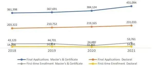 2020-2021学年,赴美国际研究生申请共计852.006份,其中中国申请人占据的比例为35%。