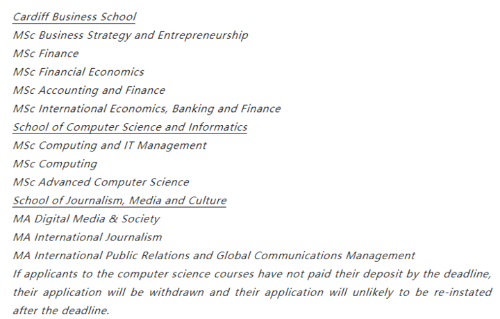 2.卡迪夫大学以下专业押金截止日期为2023年3月1日,请拿到这些专业offer的学生尽快缴纳,过期会自动取消offer。