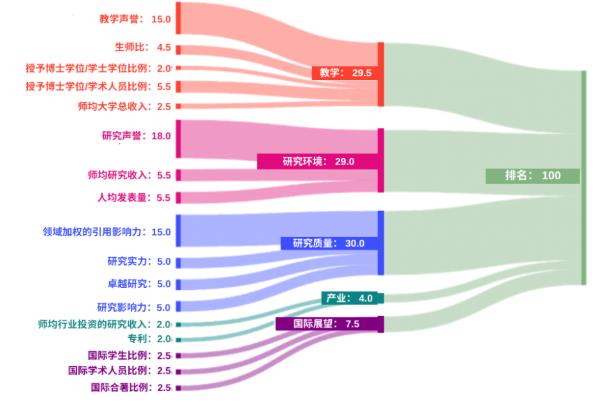 排名使用5个大类18个具体指标来进行排名,增加了研究实力、卓越研究、研究影响力、出境交换生以及专利5个细分指标。美国留学咨询