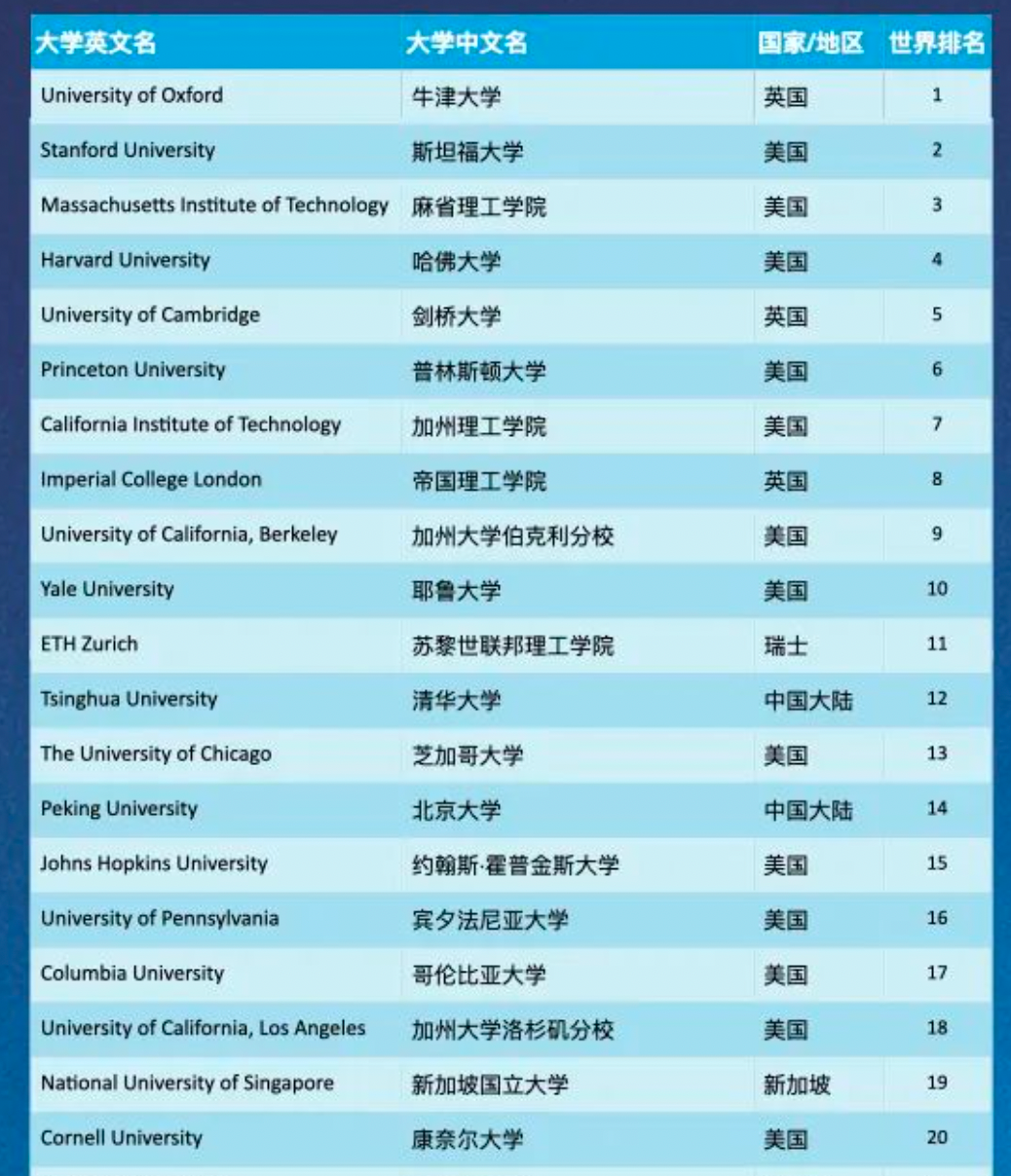 不难发现,虽然前10名的学校名次发生了一些微小的变动,但占据前10名依旧是美英院校。