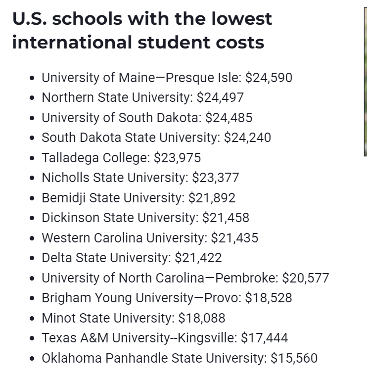 美国学费是留学总费用的主要构成之一,根据U.S.News的数据,在544所至少招收25名国际学生的大学中,有15所每年的总费用低于24,600美元。最低的费用低至15,560美元,(不包括任何获得的经济援助,包括学杂费、食宿、书籍和交通)。