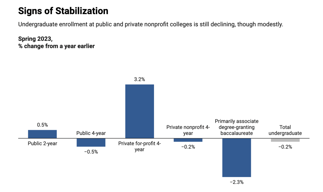 尽管与2020年(疫情前的数据相比),本科生总数减少了近120万,但和2022年春季高等教育入学人数比前一年下降了3.1%,2021年春季下降了2.4%的数据比起来,今年的入学水平还算保持了相对稳定。