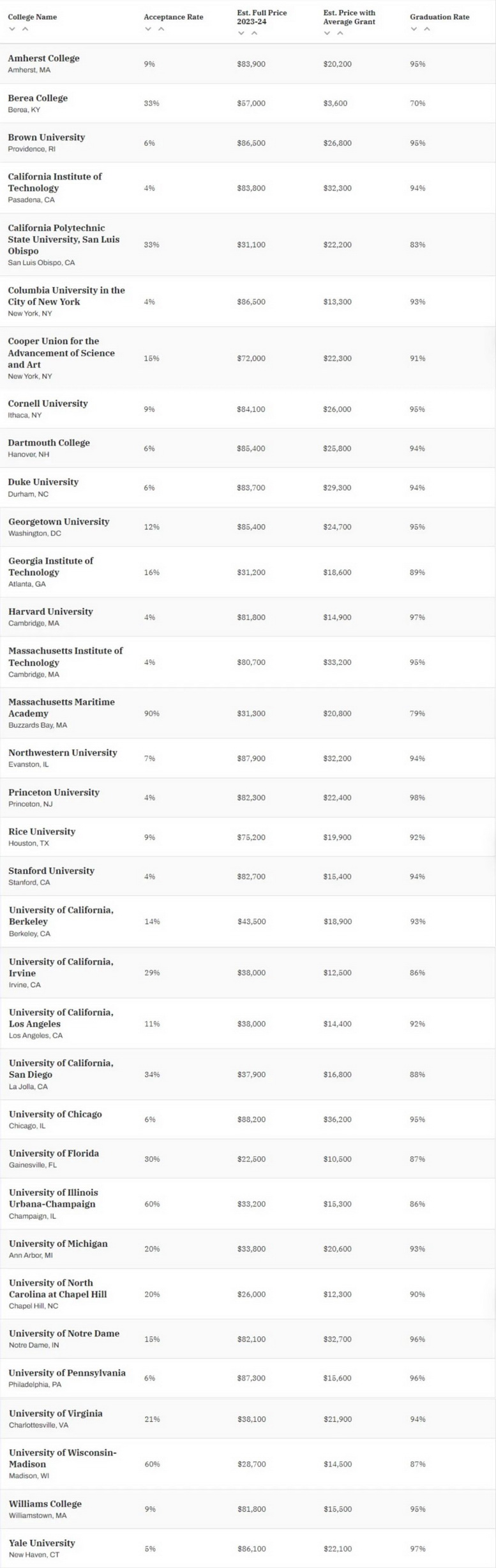 这份排名清晰展示了各大院校的本科录取率、毕业率、预计入学费用,以及预计平均补贴,为同学们择校提供了全面的参考。