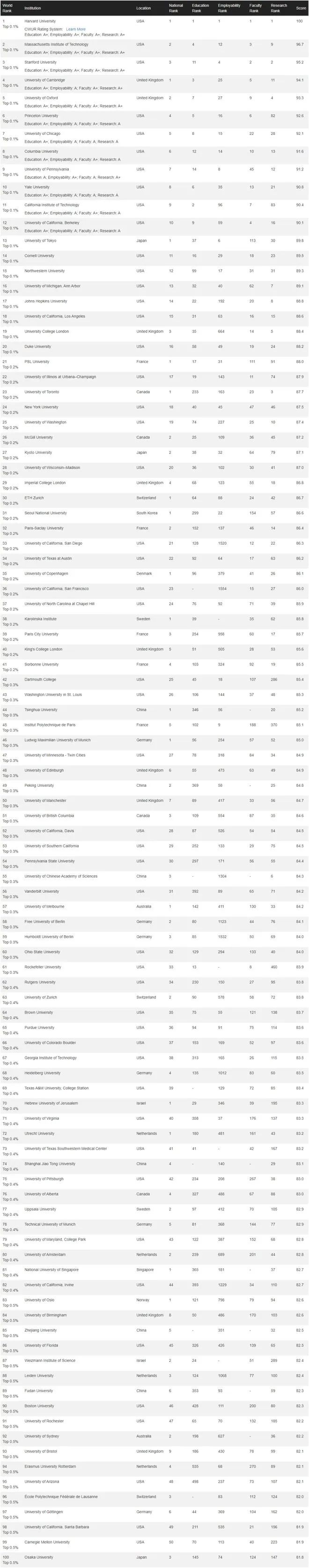 以下是今年CWUR世界前100大学排名(更多大学排名可前往CWUR官网www.cwur.org查看)