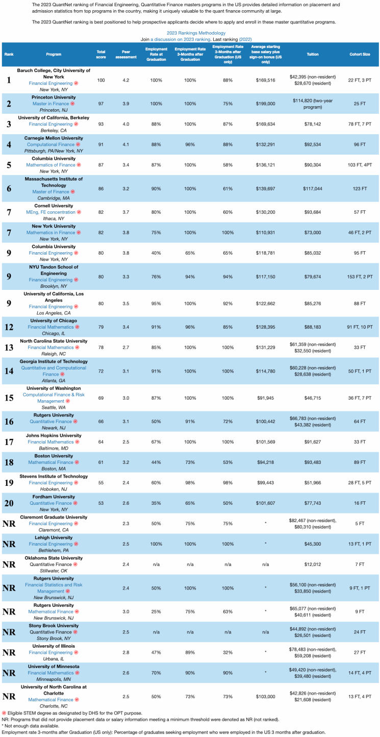 由排名方法不难看出,QuantNet排名非常看重院校的就业表现,其就业成功率占比55%,对于留学成本更高的美国而言,就业成功率可谓一项非常重要的参考因素了。