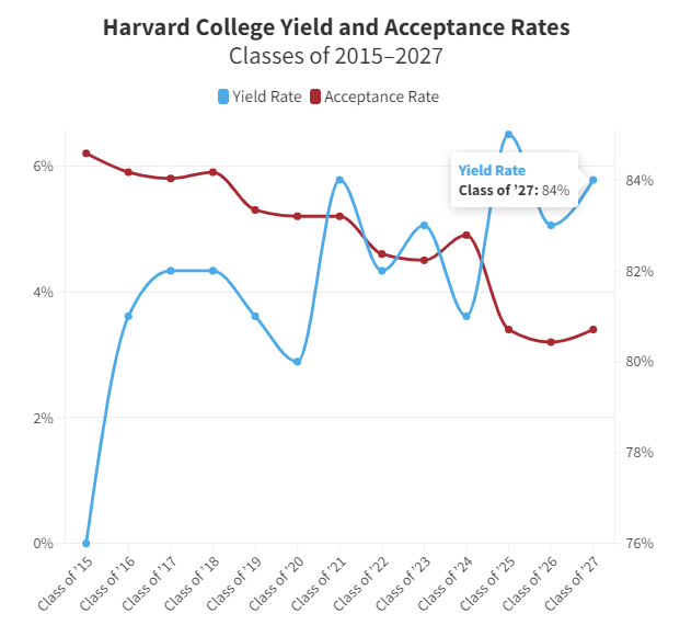 近日美国哈佛大学在上周公布,2027届约有84%的被录取学生接受了offer。这一比例略高于去年的83%,但低于2025届创纪录的85%。
