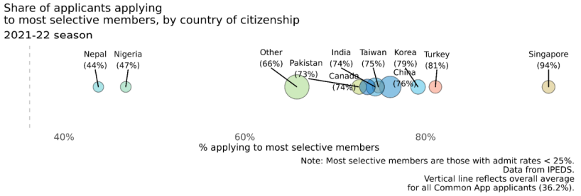 通用申请平台将录取率低于25%的会员高校定义为最具选拔性院校。数据显示,国际生更倾向于申请最具选拔性的高等院校。作为规模最为庞大的国际生群体,76%的中国学生至少申请一所该类院校,仅亚于韩国(79%)、土耳其(81%)和新加坡(94%)。作为参考,通用申请平台平均水平为36.2%。