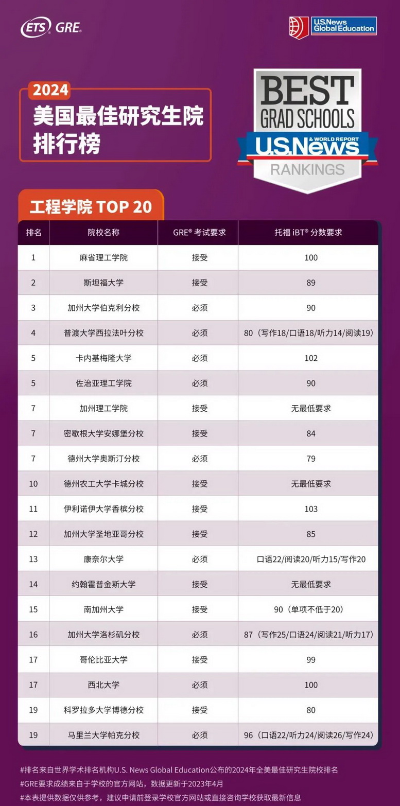 全美工程学院TOp20的所有院校都接受GRE成绩,更有将近半数院校要求23fall申请者必须提交GRE成绩。