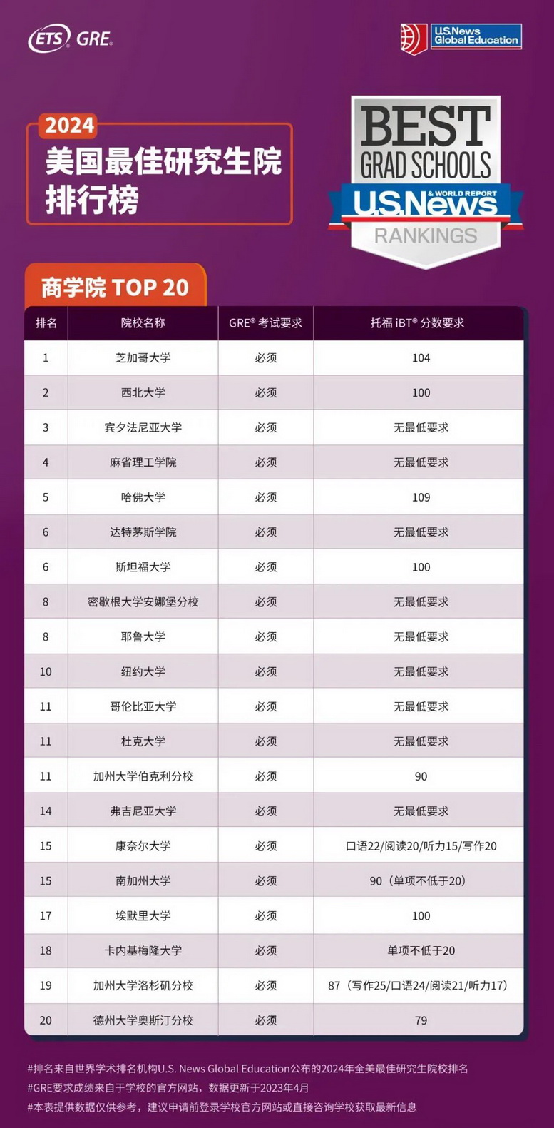 近日U.S.News官方发布了2024年U.S.News全美最佳研究生院校排名,我们为你整理出来了商科、工程及计算机专业TOp20院校排名及GRE要求,本次上榜的顶尖院校,全部要求或建议同学们使用GRE成绩进行申请!留学美国