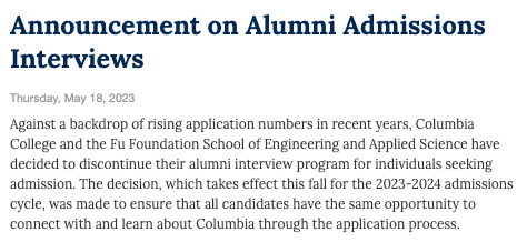 和绝大多数美国藤校一样,哥伦比亚大学之前在本科招生过程中有校友面试环节。当学生递交申请后,哥伦比亚大学会安排学生所在地工作生活的校友与申请人面试。这一项工作主要是由哥伦比亚大学两个招收本科生的学院——哥伦比亚学院(本科学院)和工程学院——的校友以志愿者的担任。