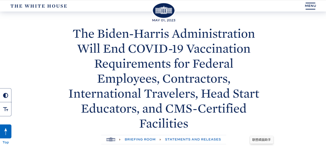此次白宫声明的关键点在结束对联邦雇员、联邦承包商和国际航空旅客的COVID-19疫苗要求。另外HHS和DHS也宣布将启动流程,终止对陆路边境的启蒙教育工作者、CMS认证的医疗机构和某些非公民的疫苗接种要求。