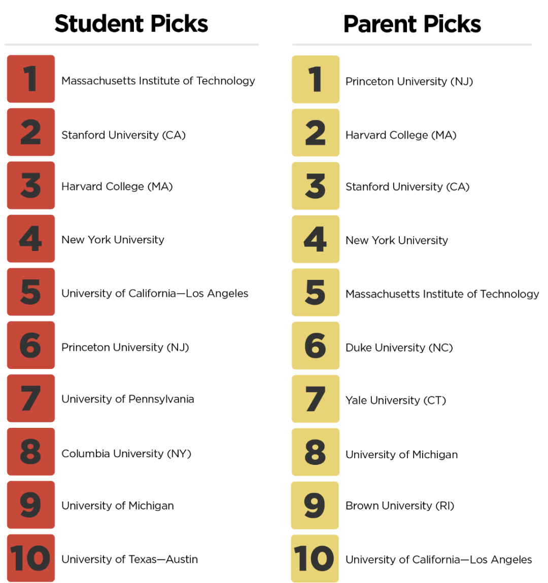 学生所选择的梦校中,有NYU、UCLA、UMich和UT四所公立大学冲进了前十,而家长们的梦校中仅有UMich和UCLA两所,其余都是老牌的顶尖私立大学。