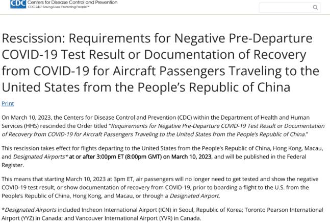 近日美国卫生与公众服务部(HHS)疾病控制与预防中心(CDC)撤销了、题为“对从中华人民共和国,飞往美国的飞机乘客的离境前COVID-19检测结果为阴性或COVID-19康复文件的要求”的命令。