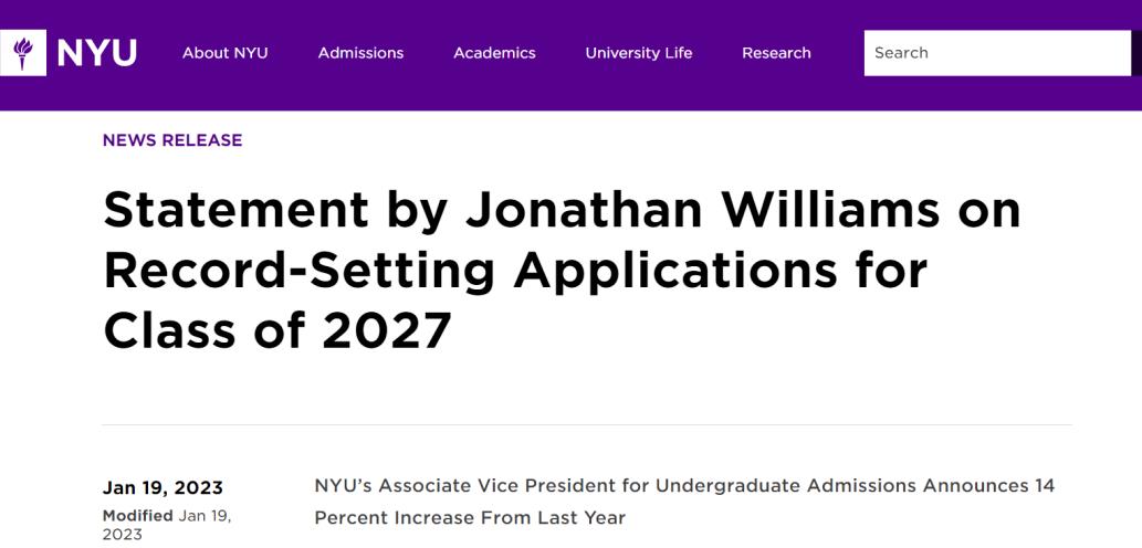 今年一共收到了近12万份2027届新生申请,总数量比去年(10.5万份)增长了13%——这是NYU连续第16年申请人数创下新纪录,也代表着NYU每年申请竞争激烈的加剧。