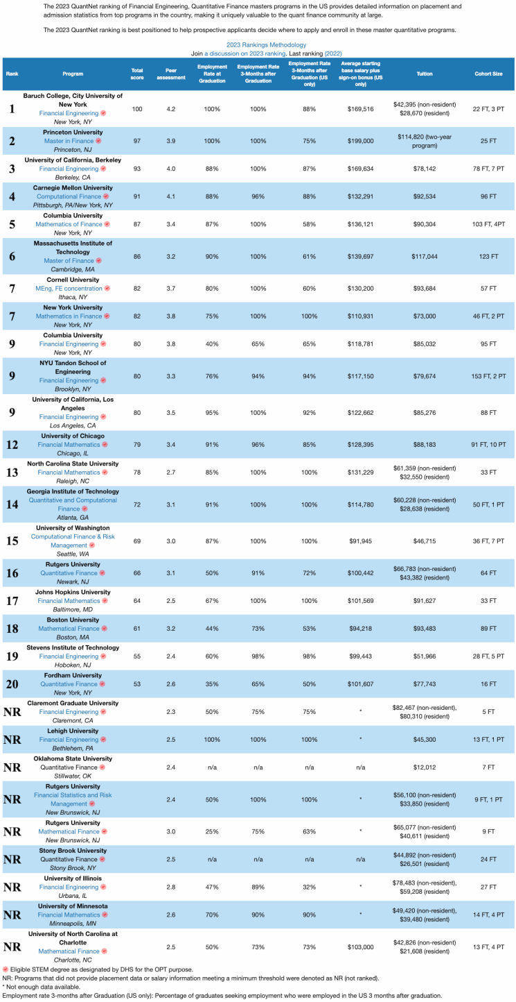 因此,对于想申请MFE项目的同学以及未来有计划留在美国实习工作的,QuantNet是一份极具参考价值的榜单。