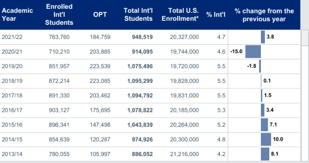 这份刚发表的报告显示:2021-2022年度,前往美国留学的国际学生总人数为948,517人;比上一年度出现3.8%的小幅回升。
